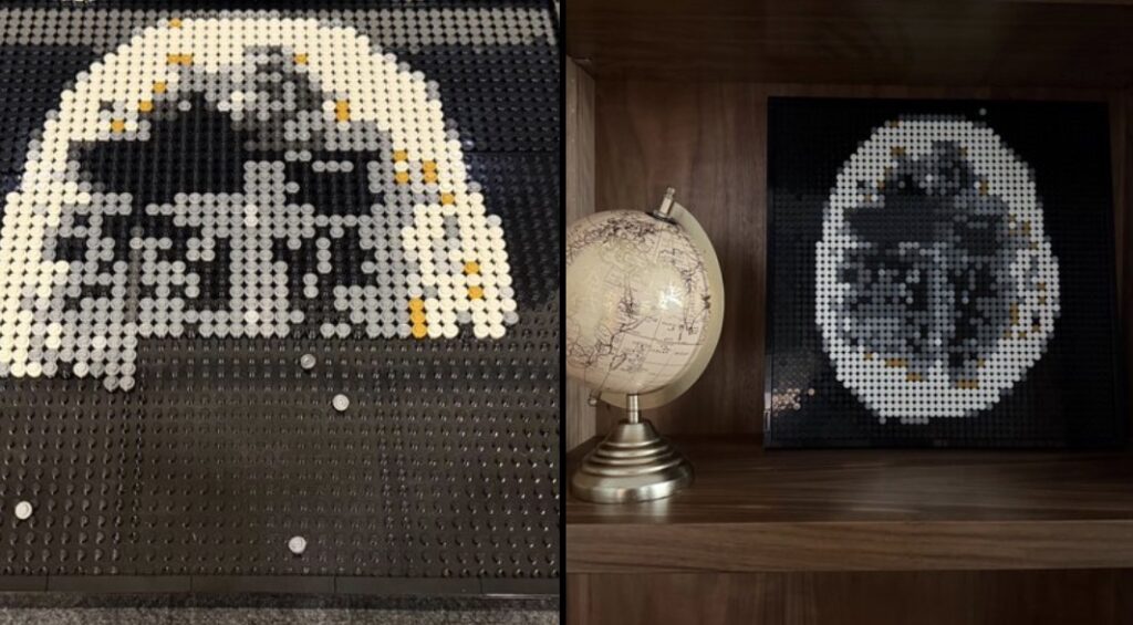 Our family had some nice, quiet snow days over the weekend here in Dallas, so I finally finished this historically interesting if morbid Lego mosaic of the first CT scan from 1971 (right frontal GBM):